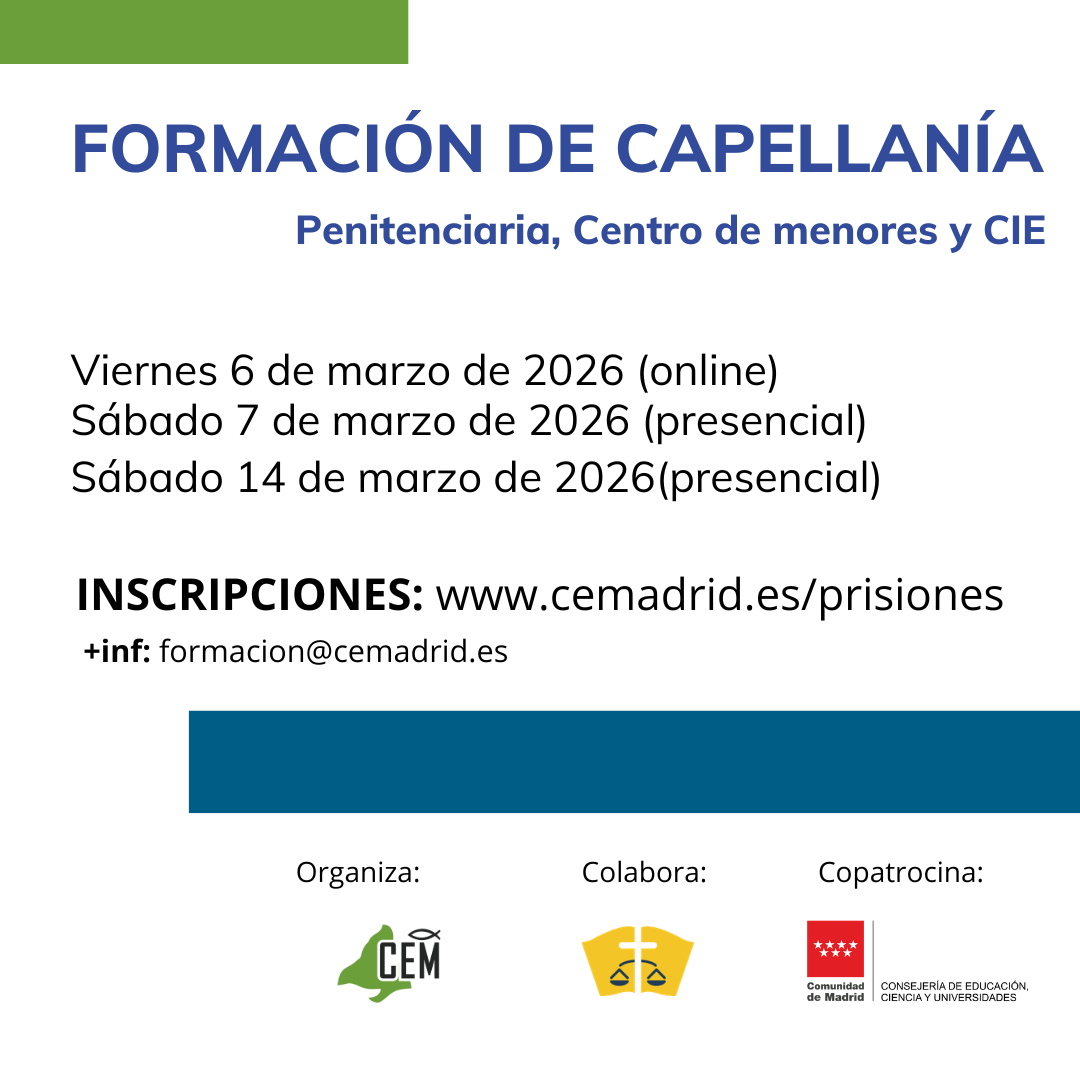 La Consejería de Asistencia Religiosa Evangélica (ARE) del Consejo Evangélico de Madrid (CEM) informa de que los próximos días, 6, 7 y 14 de Madrid 2026, se impartirá el Curso de Formación de Capellanía únicamente para Prisiones, Centros de Menores e Infractores y CIE.